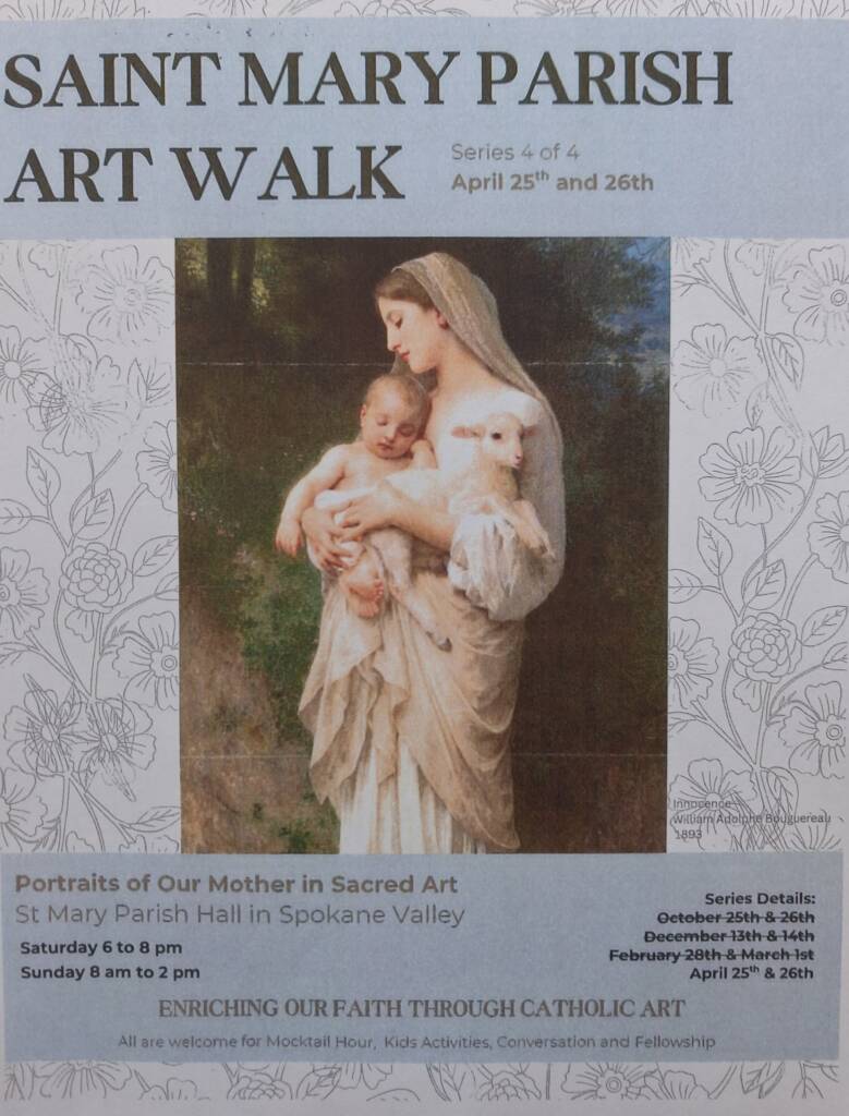 This Free Art Walk is held in the St. Mary Parish School Gym/Parish Hall at 304 S Adams Rd in Spokane Valley. “Portraits of Our Mother in Sacred Art” will be open on Saturday, April 25 from 6:00-8:00 PM and on Sunday, April 26 from 8:00 AM – 2:00 PM. Admission is free; donations are gratefully accepted. The Art Walk includes dozens of prints of famous works of art, an I Spy game and crafts for the kids, an exhibit of Rosaries and display about major Marian Shrines form around the world (including 2 Lego models), a walking labyrinth, delicious appetizers and mocktails, and a beautiful Catalog of Exhibited Art which you may take home. For more information, contact Marie Bricher at 509 928-3210 ext 111 or mbricher@dioceseofspokane.org.