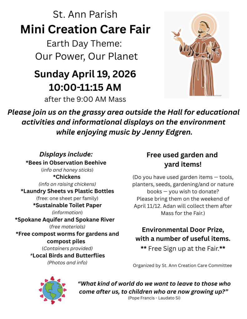 The Creation Care Team is hosting a Mini Creation Care Fair for April 19 at 10:00 to 11:15 AM, right after the 9:00 AM Mass. There will be educational activities and informational displays, music, and a table with giveaways of garden and yard items! If you have small garden items you’d like to donate, bring them to Mass the weekend of April 11 & 12. See the flyer below for more details