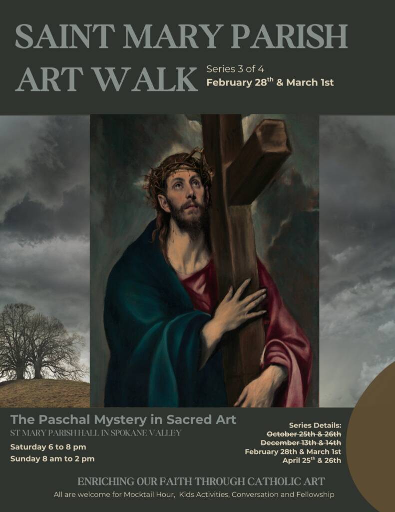 Held in the St. Mary Parish school gym/parish hall at 304 S. Adams Rd. in Spokane Valley, “The Paschal Mystery in Sacred Art” will be open on Saturday, February 28 from 6:00-8:00 pm and on Sunday, March 1 from 8:00 am until 2:00 pm. Admission is free; donations are gratefully accepted. The Art Walk includes dozens of prints of famous works of art, an I-Spy game and crafts for the kids, displays about the Stations of the Cross and the Shroud of Turnin, delicious appetizers and mocktails, and a beautiful Catalog of Exhibited Art which you may take home. For more information contact Marie at 509 928-3210 ext 111 or mbricher@dioceseofspokane.org.